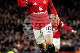 Manchester United's Matheus Cunha, center, celebrates scoring the opening goal during the English Premier League soccer match between Manchester United and Brighton & Hove Albion in Manchester, England, Saturday, Oct. 25, 2025. (AP Photo/Dave Thompson)