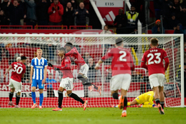 Manchester United's Bryan Mbeumo, center, scores his side's fourth goal during the English Premier League soccer match between Manchester United and Brighton & Hove Albion in Manchester, England, Saturday, Oct. 25, 2025. (AP Photo/Dave Thompson)