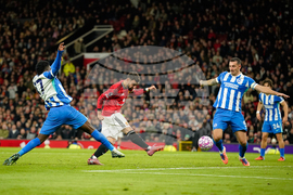 Manchester United's Matheus Cunha, left, scores the opening goal during the English Premier League soccer match between Manchester United and Brighton & Hove Albion in Manchester, England, Saturday, Oct. 25, 2025. (AP Photo/Dave Thompson)