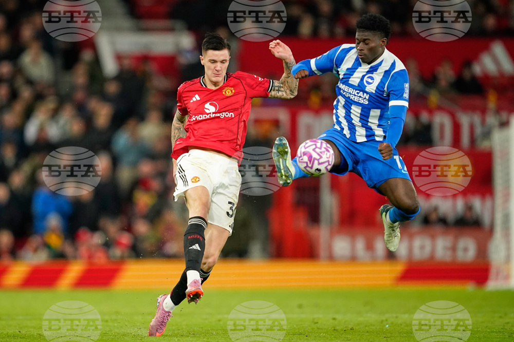 Manchester United's Bryan Mbeumo shields the ball from Brighton's Lewis Dunk during the English Premier League soccer match between Manchester United and Brighton & Hove Albion in Manchester, England, Saturday, Oct. 25, 2025. (AP Photo/Dave Thompson)
