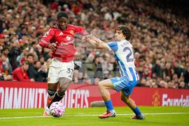Manchester United's Kobbie Mainoo, left, holds off Brighton's Ferdi Kadioglu during the English Premier League soccer match between Manchester United and Brighton & Hove Albion in Manchester, England, Saturday, Oct. 25, 2025. (AP Photo/Dave Thompson)