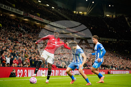 Brighton's Yankuba Minteh and Manchester United's Leny Yoro, right, battle for the ball during the English Premier League soccer match between Manchester United and Brighton & Hove Albion in Manchester, England, Saturday, Oct. 25, 2025. (AP Photo/Dave Thompson)