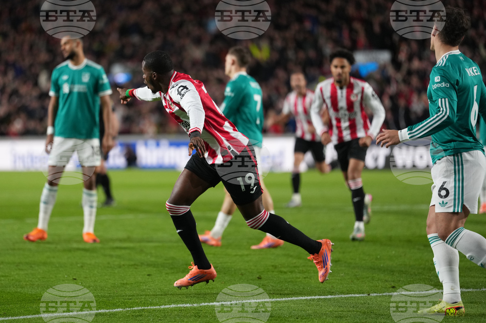 Brentford's Dango Ouattara, left, celebrates after scoring during the Premier League soccer match between Brentford and Liverpool in London, Saturday, Oct. 25, 2025. (AP Photo/Dave Shopland)