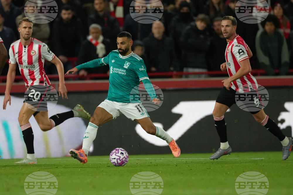 during the Premier League soccer match between Brentford and Liverpool in London, Saturday, Oct. 25, 2025. (AP Photo/Dave Shopland)