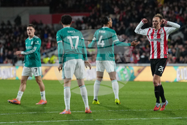 Brentford's Mikkel Damsgaard reacts after a miss during the Premier League soccer match between Brentford and Liverpool in London, Saturday, Oct. 25, 2025. (AP Photo/Dave Shopland)