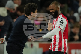 Brentford's head coach Keith Andrews smiles at Igor Thiago after he scored from a penalty during the Premier League soccer match between Brentford and Liverpool in London, Saturday, Oct. 25, 2025. (AP Photo/Dave Shopland)