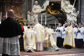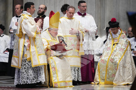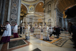 Faithful pray as Cardinal Raymond Leo Burke celebrates an old Latin Mass for pilgrims in St. Peter's Basilica, at the Vatican, Saturday, Oct. 25, 2025. (AP Photo/Alessandra Tarantino)