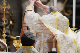 A priest looks up as Cardinal Raymond Leo Burke celebrates an old Latin Mass for pilgrims in St. Peter's Basilica, at the Vatican, Saturday, Oct. 25, 2025. (AP Photo/Alessandra Tarantino)