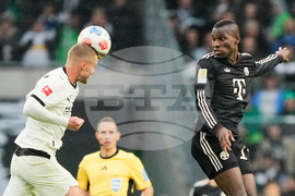 Moenchengladbach's Nico Elvedi heads the ball as Bayern's Nicolas Jackson looks on during the German Bundesliga soccer match between Borussia Moenchengladbach and Bayern Munich in Moenchengladbach, Germany, Saturday, Oct. 25, 2025. (AP Photo/Martin Meissner)