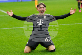 Bayern's Lennart Karl celebrates after scoring his side's third goal during the German Bundesliga soccer match between Borussia Moenchengladbach and Bayern Munich in Moenchengladbach, Germany, Saturday, Oct. 25, 2025. (AP Photo/Martin Meissner)