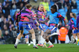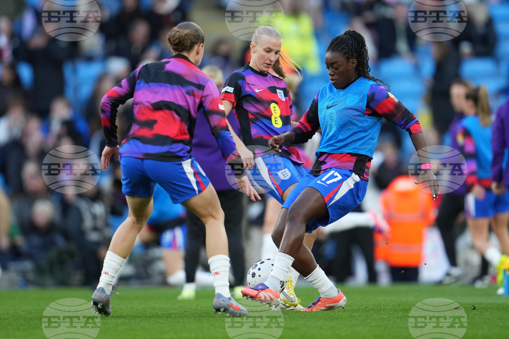 England players warming up prior to the international women's friendly soccer match between England and Brazil in Manchester, England, Saturday, Oct. 25, 2025. (AP Photo/Jon Super)