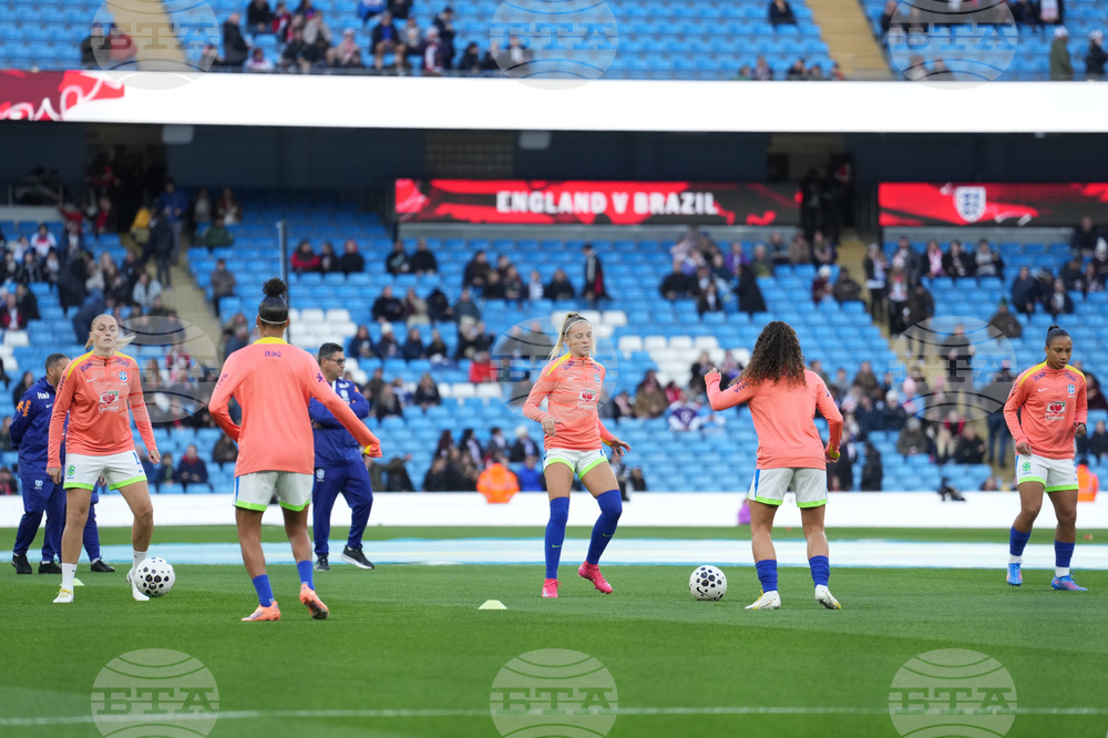 Brazil players warming up prior to the international women's friendly soccer match between England and Brazil in Manchester, England, Saturday, Oct. 25, 2025. (AP Photo/Jon Super)