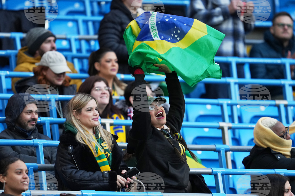 Brazil fans cheer their team prior to the international women's friendly soccer match between England and Brazil in Manchester, England, Saturday, Oct. 25, 2025. (AP Photo/Jon Super)