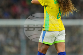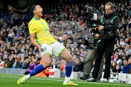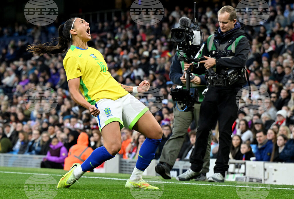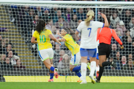 Brazil's Dudinha scores her sides second goal during an international women's friendly soccer match between England and Brazil in Manchester, England, Saturday, Oct. 25, 2025. (Cody Froggatt/PA via AP)