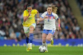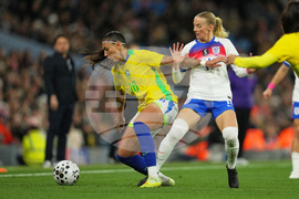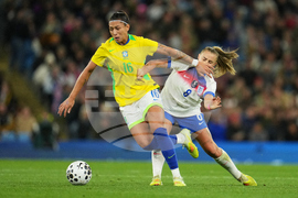 Brazil's Yasmim, right, and England's Georgia Stanway in action during an international women's friendly soccer match between England and Brazil in Manchester, England, Saturday, Oct. 25, 2025. (AP Photo/Jon Super)
