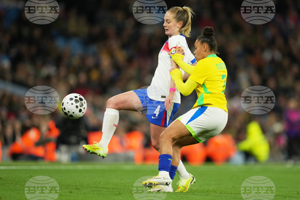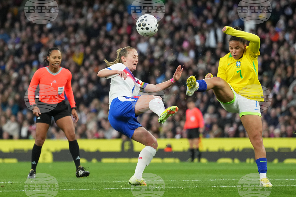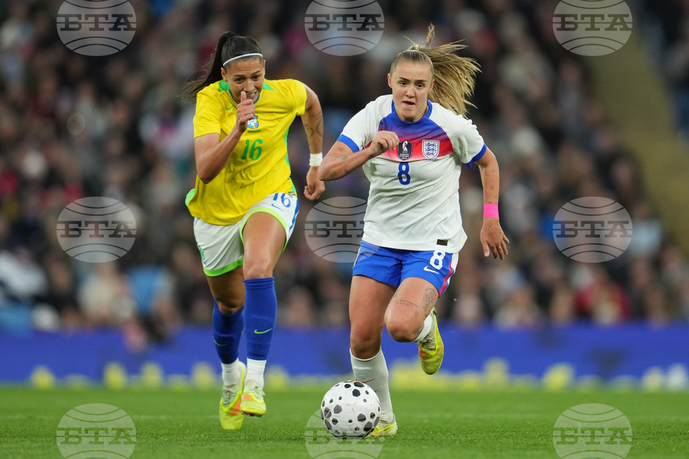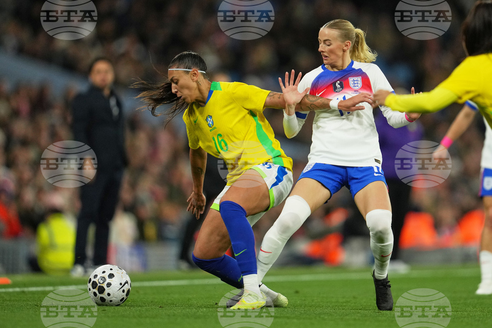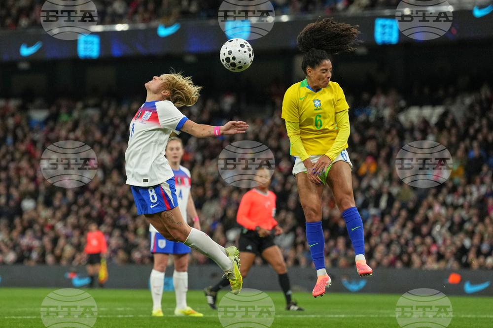 England's Bethany Mead, left, challenges for the ball with Brazil's Mariza during an international women's friendly soccer match between England and Brazil in Manchester, England, Saturday, Oct. 25, 2025. (AP Photo/Jon Super)