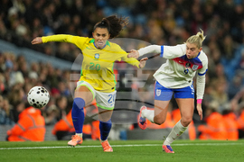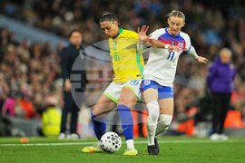 Brazil's Beatriz Joao, left, challenges for the ball with England's Georgia Stanway during an international women's friendly soccer match between England and Brazil in Manchester, England, Saturday, Oct. 25, 2025. (AP Photo/Jon Super)