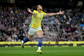 Brazil's Luany celebrates after an international women's friendly soccer match between England and Brazil in Manchester, England, Saturday, Oct. 25, 2025. (Cody Froggatt/PA via AP)