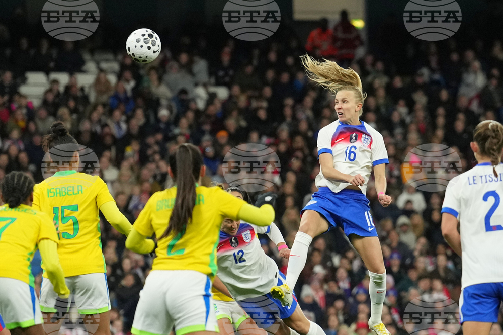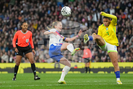 England's Alessia Russo heads the ball ahead of Brazil's Tarciane, centre, during an international women's friendly soccer match between England and Brazil in Manchester, England, Saturday, Oct. 25, 2025. (AP Photo/Jon Super)