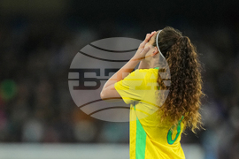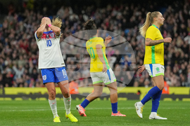 Brazil's Angelina reacts after being shown a red card during an international women's friendly soccer match between England and Brazil in Manchester, England, Saturday, Oct. 25, 2025. (Nick Potts/PA via AP)