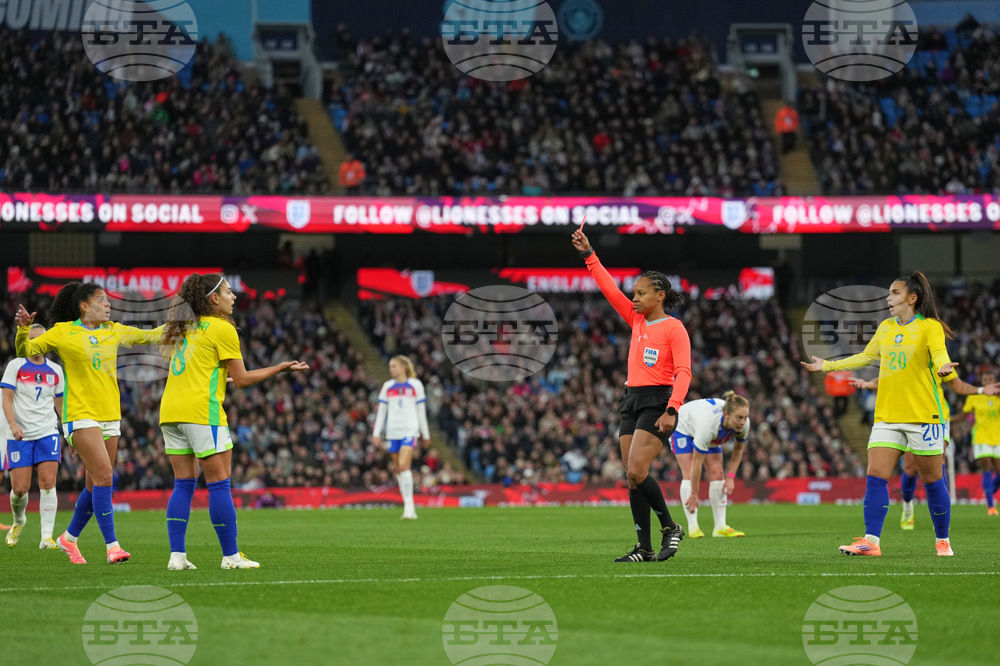 Brazil's Angelina (8) received a red card during an international women's friendly soccer match between England and Brazil in Manchester, England, Saturday, Oct. 25, 2025. (AP Photo/Jon Super)