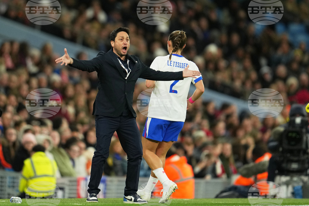 England's head coach Sarina Wiegman, left, and Brazil head coach Arthur Jose Ribas Elias greet each other ahead of the international women's friendly soccer match between England and Brazil in Manchester, England, Saturday, Oct. 25, 2025. (AP Photo/Jon Super)