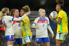 England's Chloe Kelly, left, argues with Brazil's Luany, centre, during an international women's friendly soccer match between England and Brazil in Manchester, England, Saturday, Oct. 25, 2025. (AP Photo/Jon Super)
