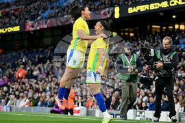 Brazil's Bia Zaneratto, right, celebrates with Duda Sampaio after scoring her sides first goal during an international women's friendly soccer match between England and Brazil in Manchester, England, Saturday, Oct. 25, 2025. (Cody Froggatt/PA via AP)