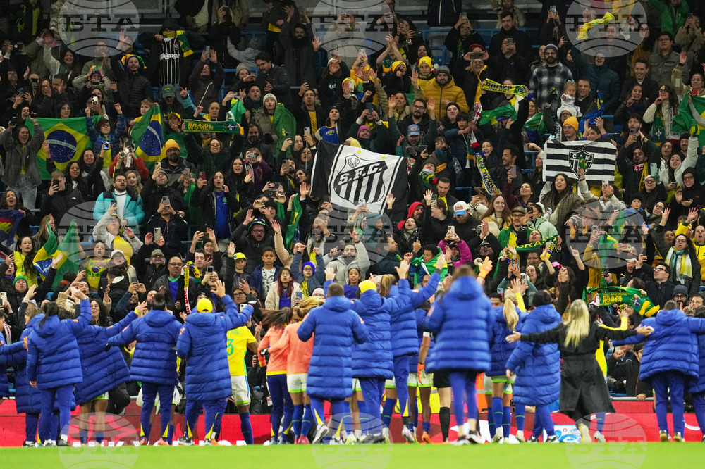 Brazil players greet fans after an international women's friendly soccer match between England and Brazil in Manchester, England, Saturday, Oct. 25, 2025. (AP Photo/Jon Super)