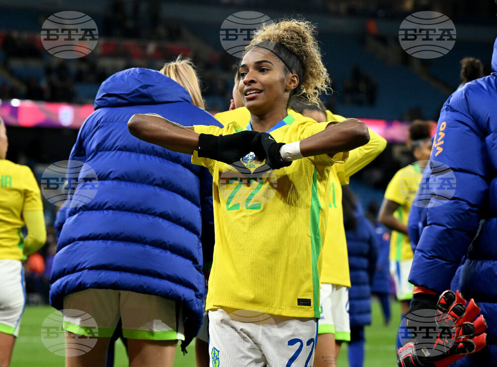 Brazil's Tarciane, left, and Brazil's Ary Borges celebrate after an international women's friendly soccer match between England and Brazil in Manchester, England, Saturday, Oct. 25, 2025. (Cody Froggatt/PA via AP)