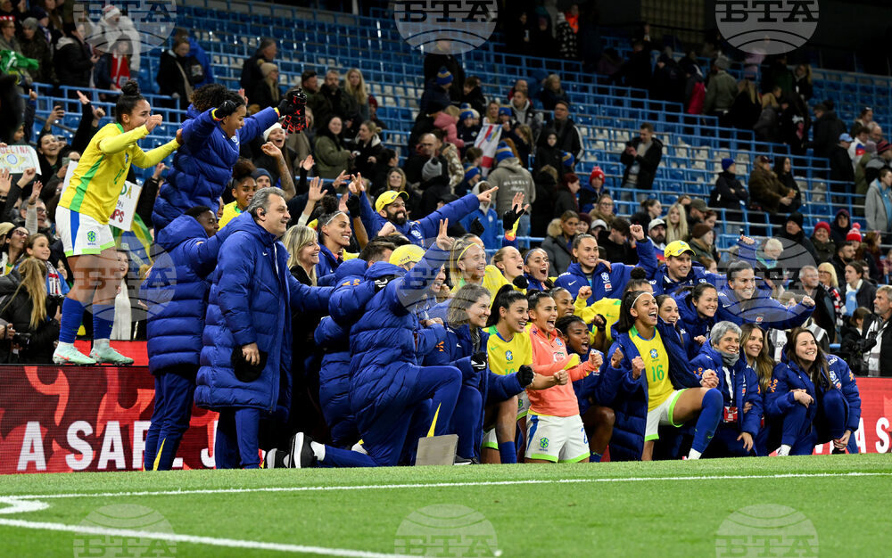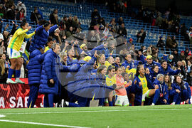 Brazil's players and staff celebrate after an international women's friendly soccer match between England and Brazil in Manchester, England, Saturday, Oct. 25, 2025. (Cody Froggatt/PA via AP)