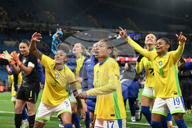 Brazil's players celebrate after an international women's friendly soccer match between England and Brazil in Manchester, England, Saturday, Oct. 25, 2025. (Cody Froggatt/PA via AP)