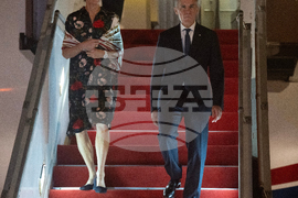 Canadian Prime Minister Mark Carney and his wife Diana Fox Carney disembark a government plane as they arrive in Kuala Lumpur, Malaysia, Saturday, Oct. 25, 2025. (Adrian Wyld /The Canadian Press via AP)