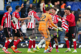 Sunderland's Chemsdine Talbi, right, celebrates with goalkeeper Robin Roefs at the end of the English Premier League soccer match between Chelsea and Sunderland in London, Saturday, Oct. 25, 2025. (AP Photo/Joanna Chan)