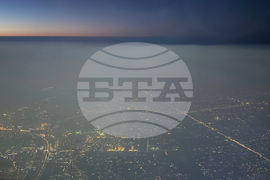 A layer of smog hangs over the skyline as seen from an aircraft window in New Delhi, India, Saturday, Oct. 25, 2025. (AP Photo/Yirmiyan Arthur)