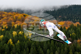Slovenia's Nika Prevc competes in the ski jumping event, Saturday, Oct. 25,2 05, in Klingenthal, Germany. (Hendrik Schmidt/dpa via AP)