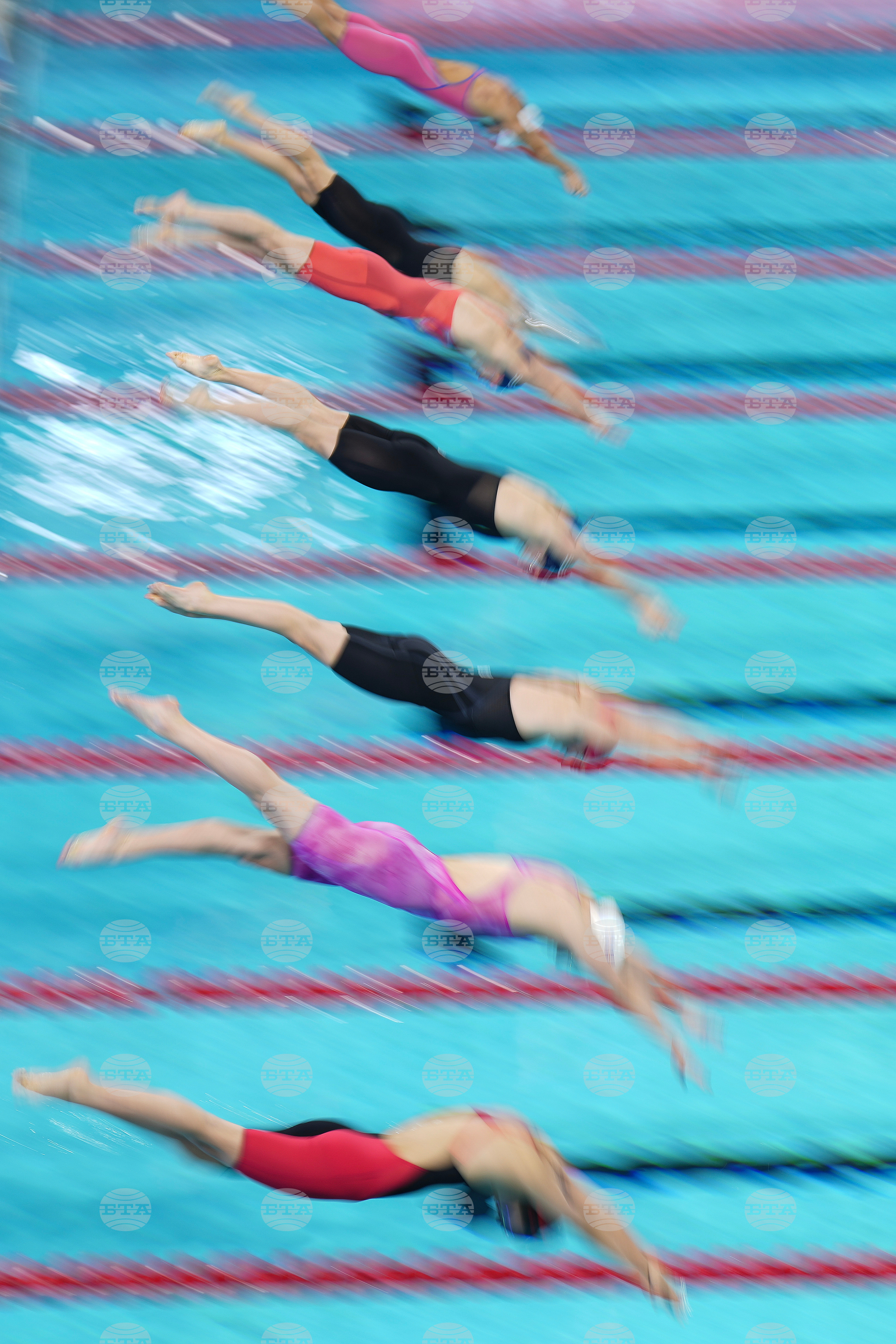 Swimmers leave the blocks as they compete in the women's 100-meter butterfly at the World Aquatics Swimming World Cup in Toronto, Saturday, Oct. 25, 2025. (Chris Young/The Canadian Press via AP)