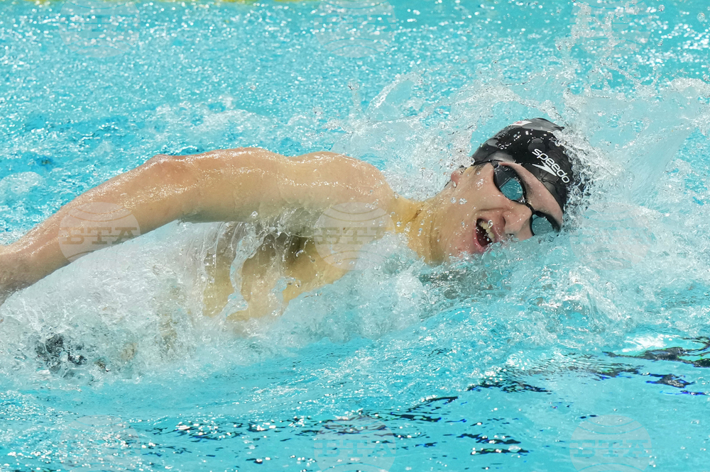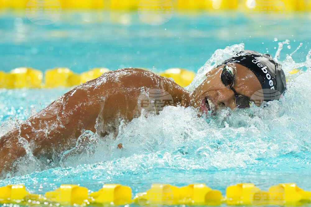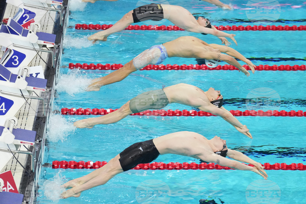 Hungary's Hubert Kos leaves the blocks as he competes in the men's 100-meter backstroke at the World Aquatics Swimming World Cup in Toronto, Saturday, Oct. 25, 2025. (Chris Young/The Canadian Press via AP)