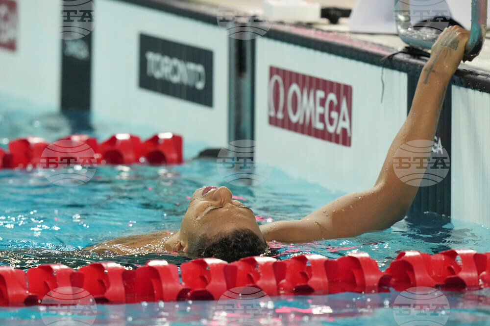 Hungary's Hubert Kos reacts after breaking the world record as he wins the men's 100-meter backstroke at the World Aquatics Swimming World Cup in Toronto, Saturday, Oct. 25, 2025. (Chris Young/The Canadian Press via AP)
