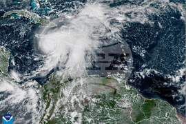 This satellite image provided by NOAA shows Tropical Storm Melissa on Saturday, Oct. 25, 2025. (NOAA via AP)