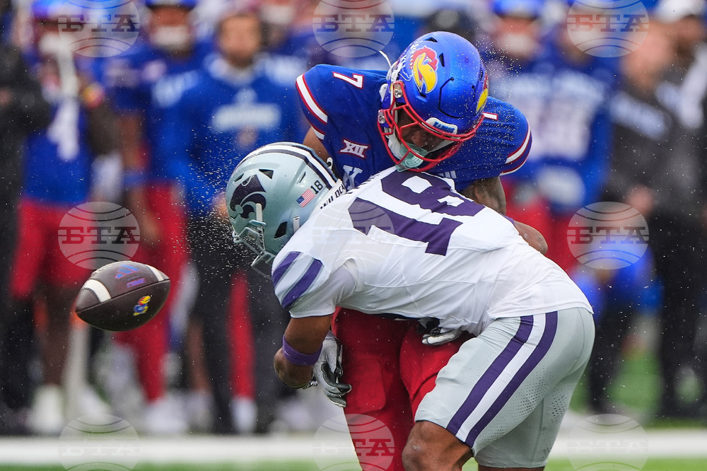 Kansas State safety Wesley Fair (18) breaks up a pass intended for Kansas wide receiver Cam Pickett (7) during the first half of an NCAA college football game Saturday, Oct. 25, 2025, in Lawrence, Kan. (AP Photo/Charlie Riedel)