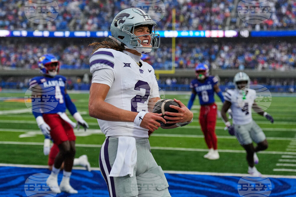 Kansas State quarterback Avery Johnson (2) celebrates after scoring a touchdown during the first half of an NCAA college football game against Kansas, Saturday, Oct. 25, 2025, in Lawrence, Kan. (AP Photo/Charlie Riedel)