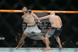 Russia's Alexander Volkov, right, battles Brazil's Jailton Almeida during a bantamweight bout at the mixed martial arts UFC Fight Night in Abu Dhabi, United Arab Emirates, Saturday, Oct. 25, 2025. (AP Photo/Altaf Qadri)