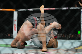 Russia's Alexander Volkov, Top, battles Brazil's Jailton Almeida during a bantamweight bout at the mixed martial arts UFC Fight Night in Abu Dhabi, United Arab Emirates, Saturday, Oct. 25, 2025. (AP Photo/Altaf Qadri)