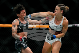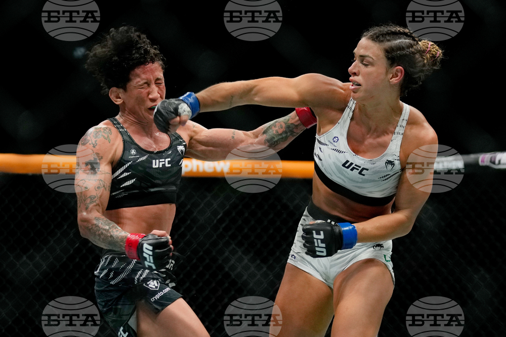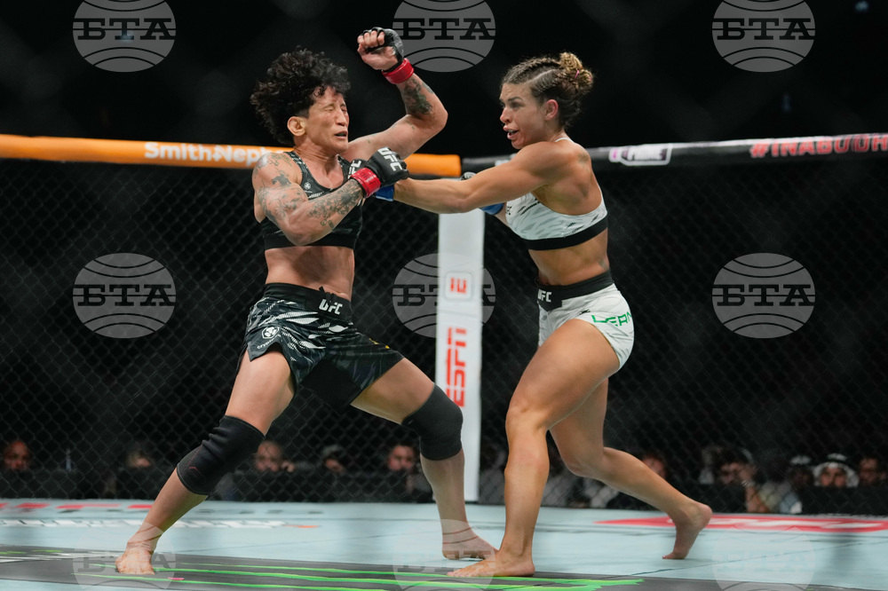 Brazil's Brazil's Mackenzie Dern, right, punches Virna Jandiroba during women's strawweight title boutat the mixed martial arts UFC Fight Night in Abu Dhabi, United Arab Emirates, Saturday, Oct. 25, 2025. (AP Photo/Altaf Qadri)