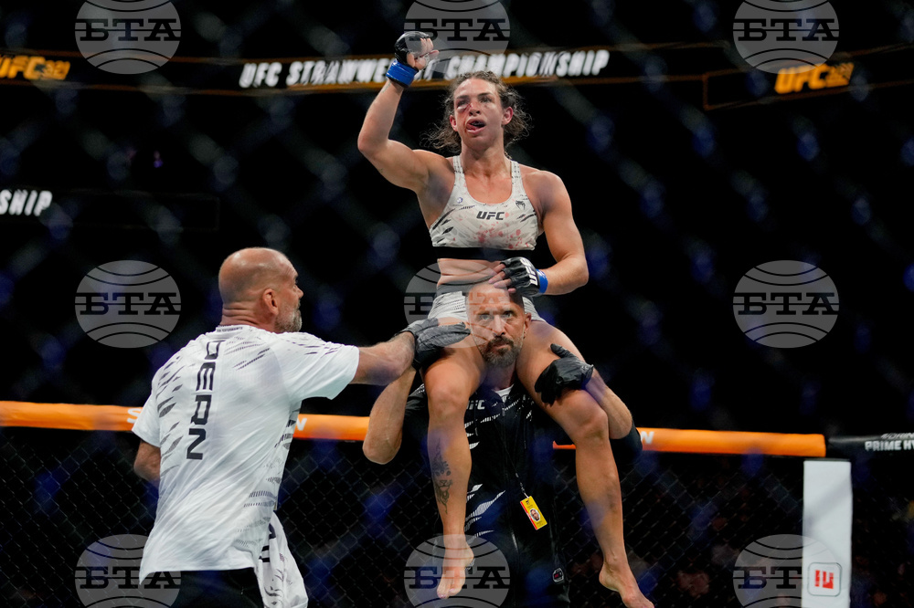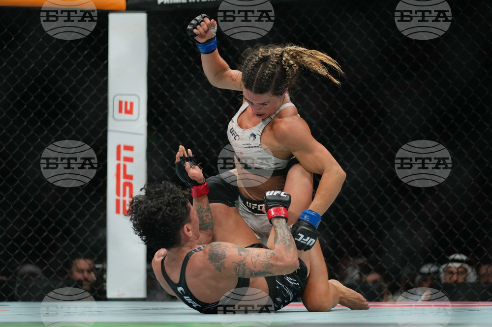 Brazil's Brazil's Mackenzie Dern, right, fight Virna Jandiroba during a women's strawweight title bout at the mixed martial arts UFC Fight Night in Abu Dhabi, United Arab Emirates, Saturday, Oct. 25, 2025. (AP Photo/Altaf Qadri)