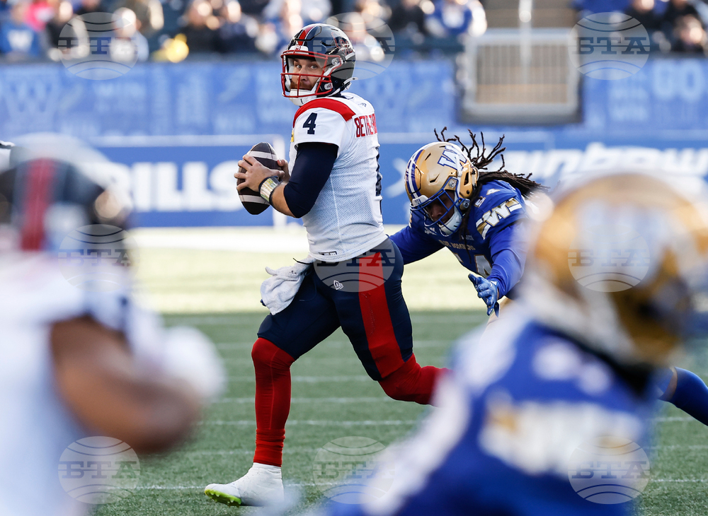 Winnipeg Blue Bombers' Kydran Jenkins (54) applies pressure to Montreal Alouettes quarterback McLeod Bethel-Thompson (4) during second half CFL action in Winnipeg Saturday, Oct. 25, 2025. (John Woods/The Canadian Press via AP)