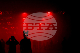 A man wearing a bunny ear balaclava dances during a Halloween rave in Kyiv, Ukraine, Saturday, Oct. 25, 2025. (AP Photo/Julia Demaree Nikhinson)