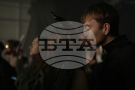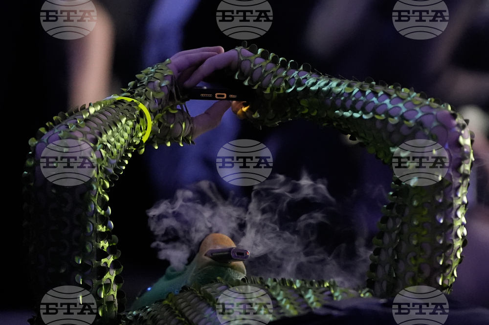 A person wearing alien sunglasses blows soap bubbles during a Halloween rave in Kyiv, Ukraine, Saturday, Oct. 25, 2025. (AP Photo/Julia Demaree Nikhinson)