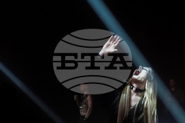 A woman wearing devil horns attends a Halloween rave in Kyiv, Ukraine, Saturday, Oct. 25, 2025. (AP Photo/Julia Demaree Nikhinson)
